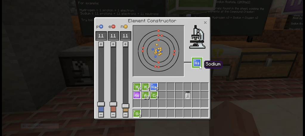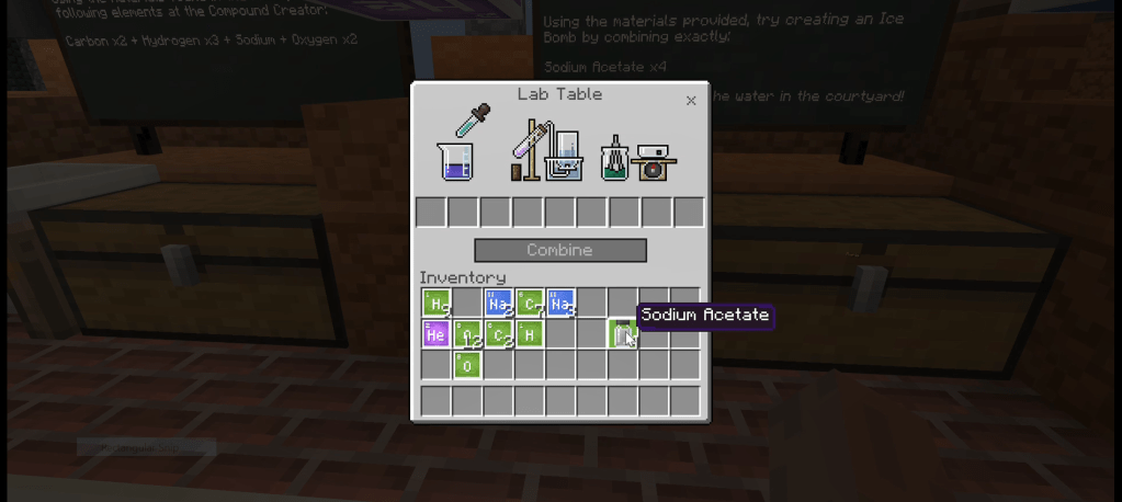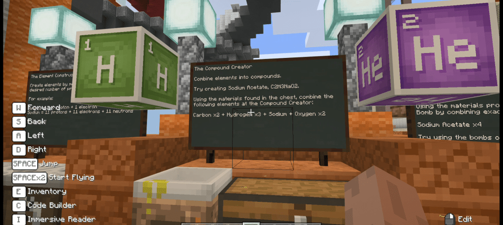 - While playing the game there could be open play construction, challenges created by the teacher or in pre loaded worlds such as a Chemistry Lab where they have to complete challenges such as making elements, combining these into compounds and completing further challenges with these compounds. (See Figure 9, 10 and 11)