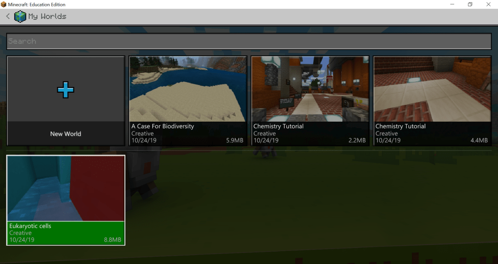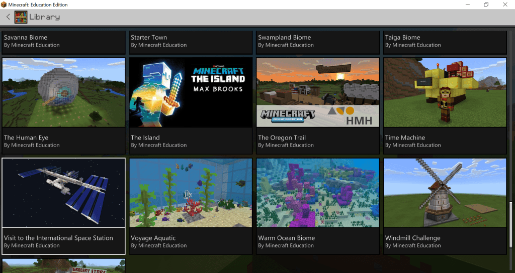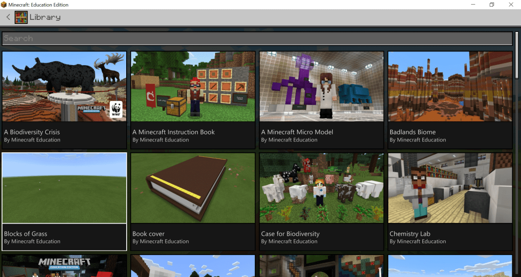 - “View Library” which allows the user to view worlds that have been generated by Minecraft Education for specific lessons plans. For Science the kinds of worlds that are available are worlds that explore (see Figures 6, 7 and 8):